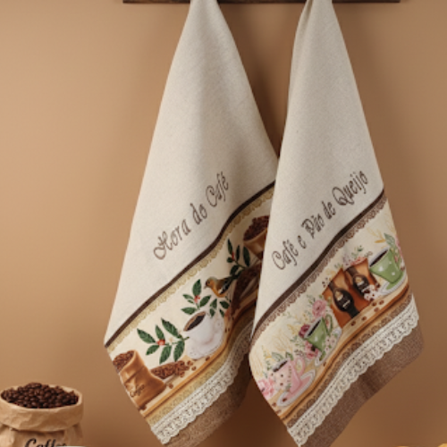 Nossa sacaria rústica é um clássico que nunca sai de moda. Produzido com tecido de alta absorção, este kit traz o barrado temático de Café e Chá da Tarde, ideal para quem valoriza a beleza nos detalhes do cotidiano.