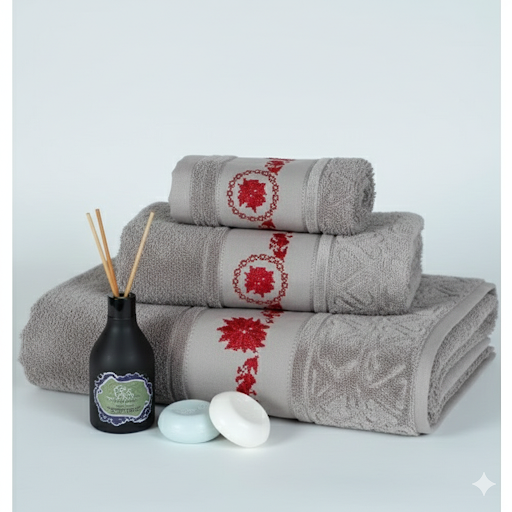 O kit contém uma toalha de banho, uma toalha de rosto e uma toalha social, todas com bordados e acabamento de alta qualidade.