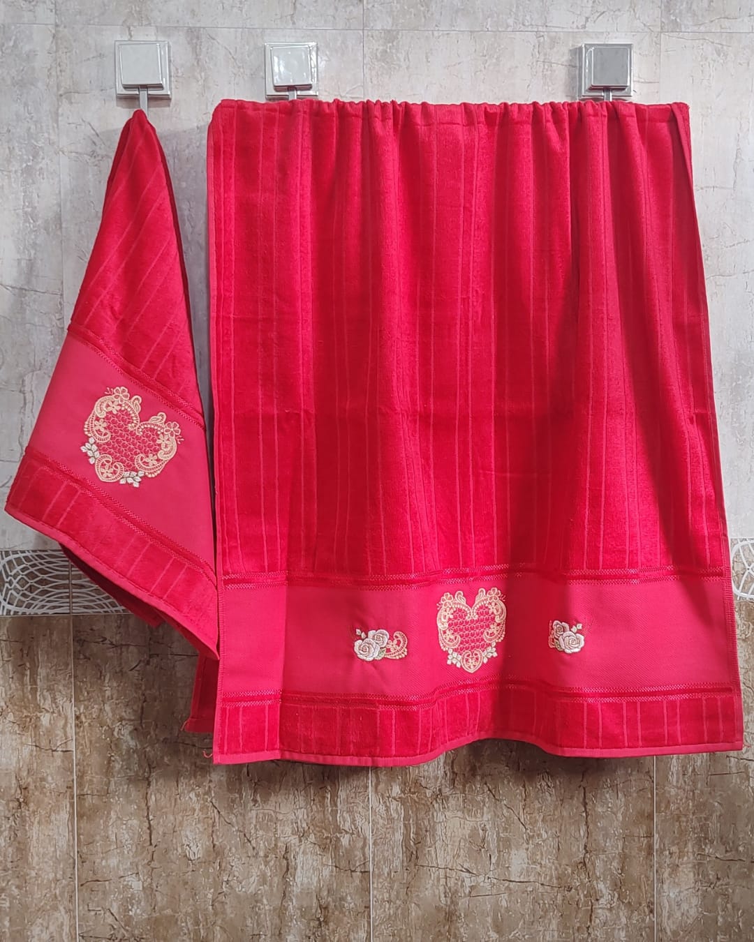 O conjunto traz um toque romântico e sofisticado com bordados delicados de corações em linha bege, aplicados sobre o fundo vermelho vibrante das toalhas.