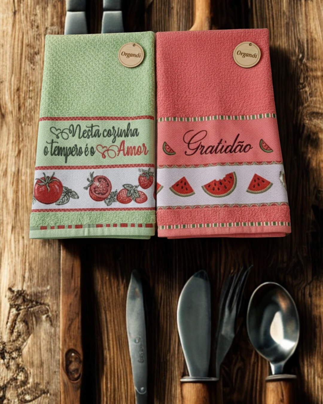 Com um toque macio e excelente absorção, cada peça recebeu um bordado artesanal cuidadoso, trazendo frases que inspiram o dia a dia: "Nesta cozinha o tempero é o Amor" e "Gratidão". O barrado decorativo com temas de frutas (tomates, morangos e melancias) completa o visual rústico e delicado.