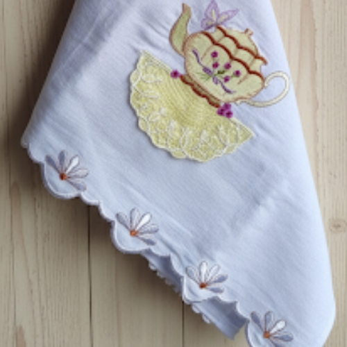 O pano de prato tem a base em tecido branco, com bordado colorido do tema "Hora do Chá" e renda na tonalidade amarela, reforçando a delicadeza da peça. O acabamento em renda tem detalhes florais, que dão charme extra à peça sem perder a praticidade. Confeccionado em sacaria 100% algodão. Medindo 45x70 em média